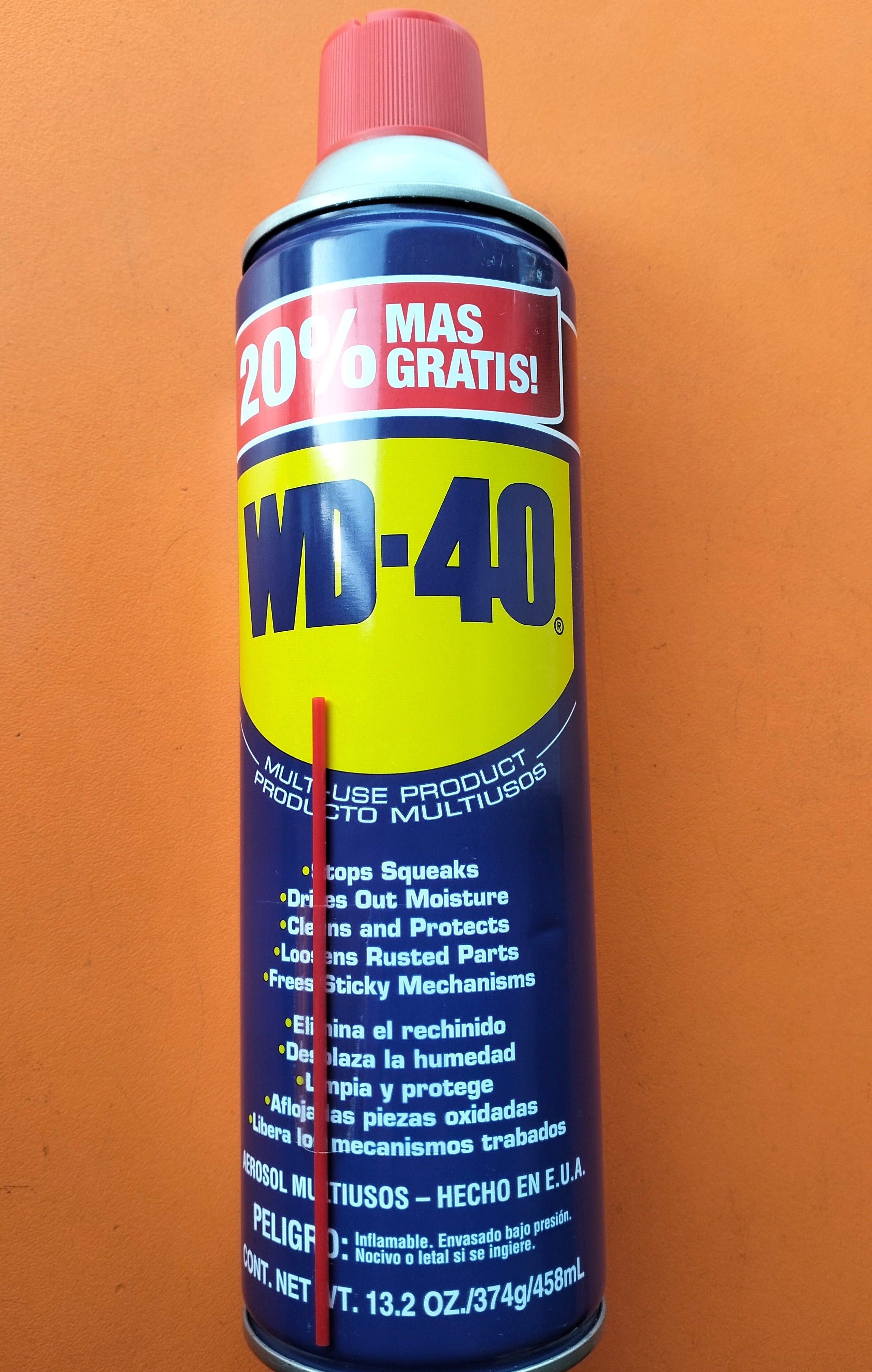 El WD 40 es un producto químico multiusos popularmente conocido por sus propiedades de aflojamiento, lubricación, protección contra la corrosión y limpieza. Su nombre proviene de "Water Displacement 40th attempt" (Desplazamiento de Agua, 40º intento), ya que fue el resultado de un intento por parte de la compañía para desarrollar un compuesto que pudiera repeler el agua y evitar la corrosión.